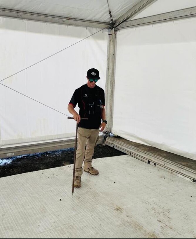 Site supervisor Michael Chance (Chancey) has been flown in from Australia to install this flooring ready for the WRC Rally in Auckland.