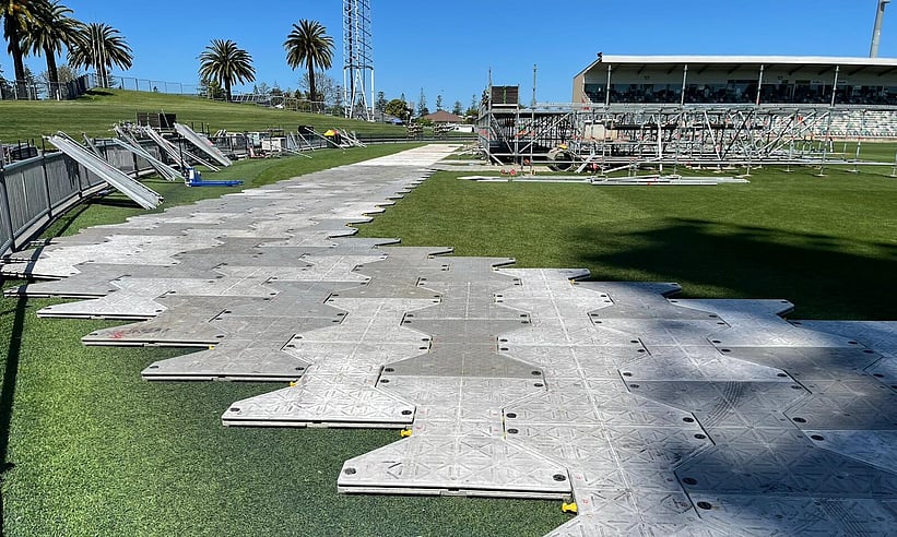 Used on grass for stage bases, mosh pits, temporary parking areas and even helipads, I-Trac leaves the turf in excellent condition underneath. While other products on the market contain aluminium, I-Trac is made of polypropylene, protecting the grass from immediate burning. The white colour deflects heat while allowing light through to the grass, resulting in healthier turf.